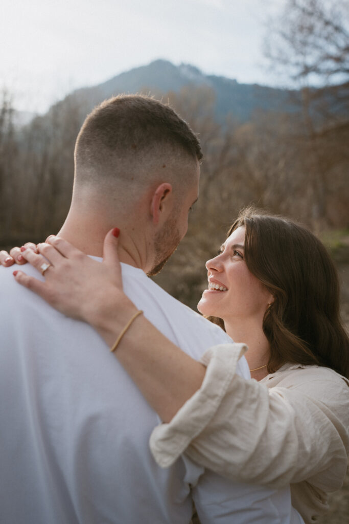 Once we reached the riverbank, the golden hour light started SHOWING OFF. It was time. I directed Jaclyn to “admire the mountains” while Garrett prepared for his big moment. As she gazed out at the stunning landscape, he put the ring box in his pocket, stepped close, and began pouring his heart out. In that golden moment, surrounded by the whispers of the river and the warmth of the setting sun, Garrett got down on one knee and asked Jaclyn to spend forever with him. Spoiler alert: She said yes!
